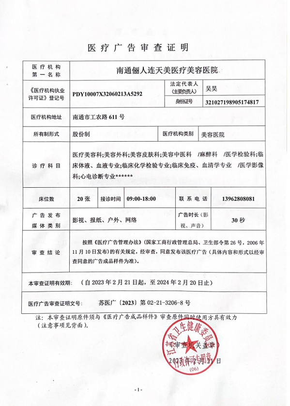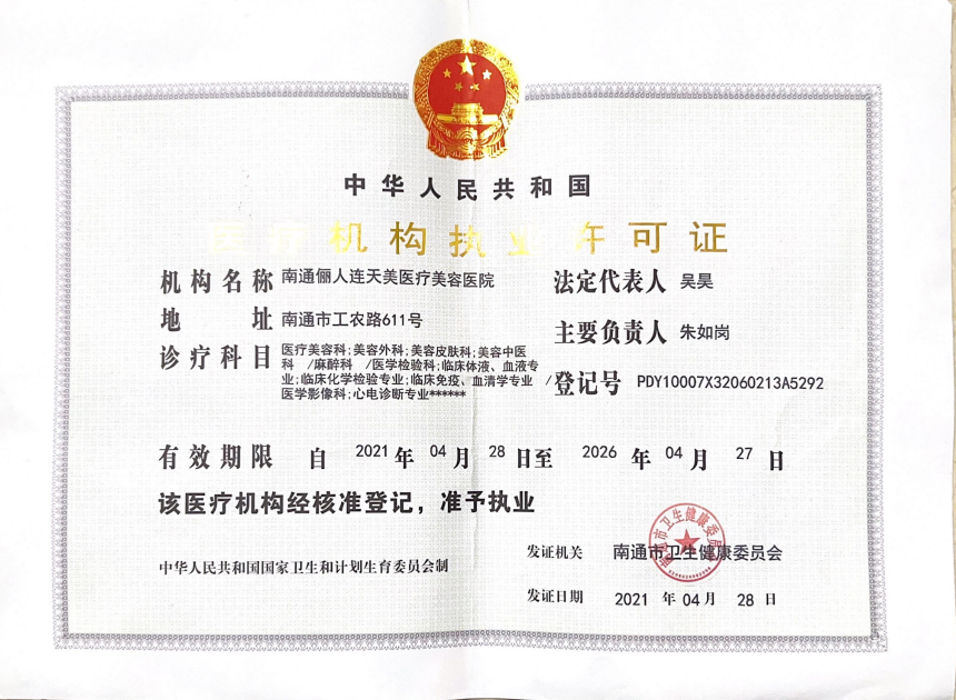 南通儷人連天美醫(yī)療美容醫(yī)院是與著名的醫(yī)療美容集團合作建立的醫(yī)院,醫(yī)院提供高品質(zhì)的醫(yī)療美容服務(wù)。2008年,南通儷人連天美醫(yī)療美容醫(yī)院落戶南通,成為由南通衛(wèi)生局審批的專業(yè)醫(yī)療美容醫(yī)院。南通儷人連天美醫(yī)療美容醫(yī)院,特別設(shè)有專業(yè)的整形美容科、皮膚美容科和微創(chuàng)美容科三大科室,致力于為廣大求美者提供全方位的醫(yī)療美容服務(wù)。南通儷人連天美醫(yī)療美容醫(yī)院為求美者建立個人終生美麗檔案,一對一進行細(xì)致服務(wù)。 11年來,南通儷人連天美醫(yī)療美容醫(yī)院,不斷引進先進設(shè)備,不斷完善醫(yī)美技術(shù),一批優(yōu)秀、專業(yè)而穩(wěn)定的醫(yī)生團隊,為無數(shù)求美者鑄就美麗夢想。